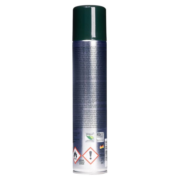 Използвайте само в проветриви помещения или, ако е възможно, на открито. Разстоянието за пръскане трябва да бъде 20 cm, за да се постигне равномерно и фино разпръскване; ако е необходимо, след нанасянето напрегнете кожата. За основна импрегнация преди първото носене, третирайте материала с най-малко 3 не толкова влажни пръскания. След около 8-10 пъти носене, подновете импрегнационната защита.