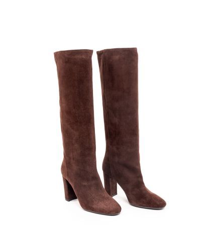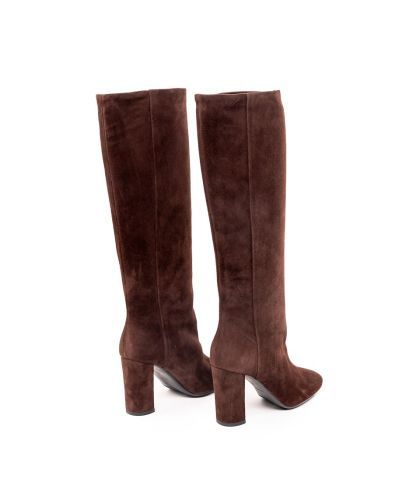 - Дамски кафяви ботуши от естествен велур с широк ток