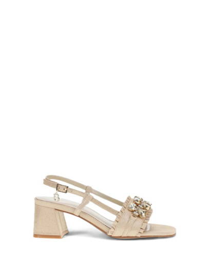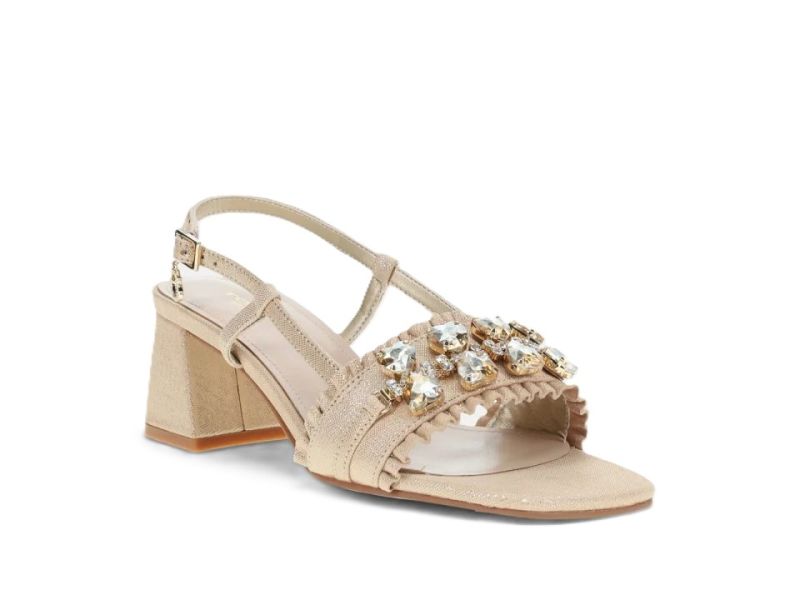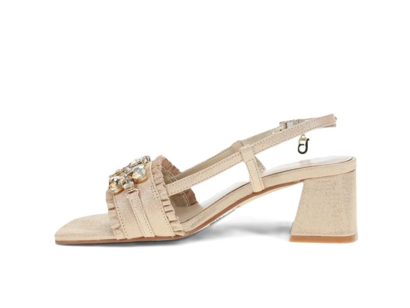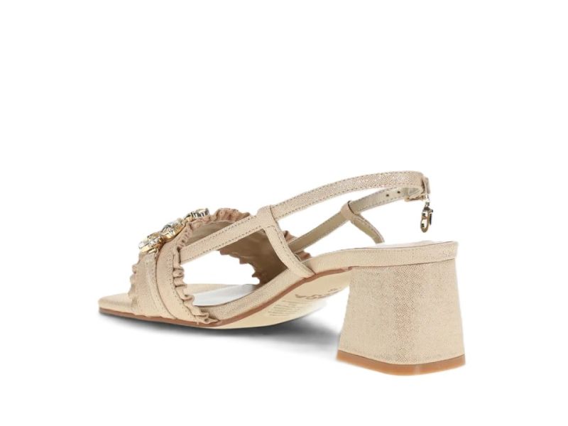 Тези елегантни сандали в златист цвят са предназначени за тези, които търсят детайл, който прави разликата. Изисканата набрана лента, украсена с камъни, създава ценни отблясъци при всяко движение. Дебелият 6-сантиметров ток и тънката каишка с монограмно украшение правят тези елегантни кожени сандали идеални за коктейлна рокля или копринен костюм.