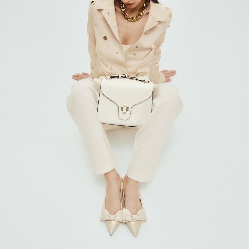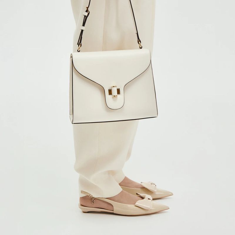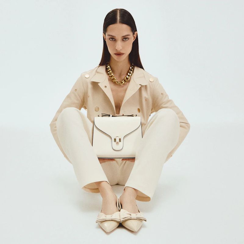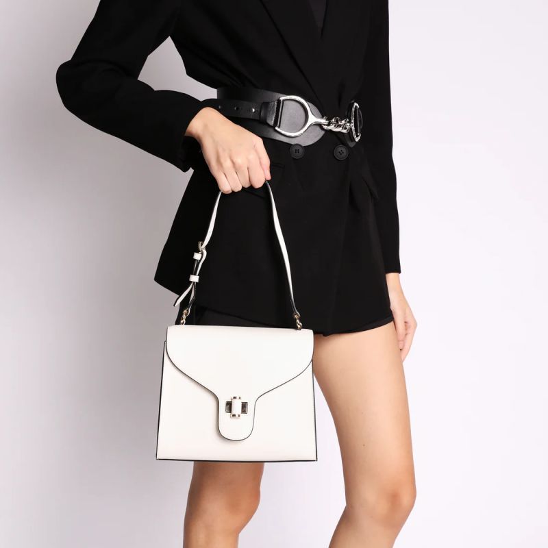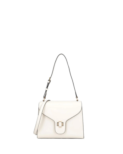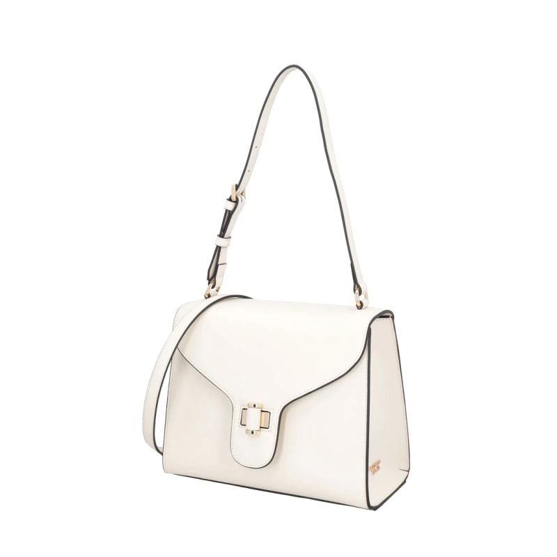 Направете срещите си специални с тази модерна кожена чанта от Tosca Blu. Предлагана в луксозен цвят слонова кост, тя е идеалният аксесоар за жената, която обръща внимание на детайлите. Независимо дали я носите през рамо или на рамо, едното отделение и емблематичната заключваща се катарама правят този модел едновременно практичен и изискан. Трапецовидната форма, контрастираща с извитите, плавни линии на капака, превръща тази кожена чанта в модерен и елегантен аксесоар, който ще придаде стил на визията ви.
