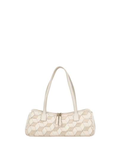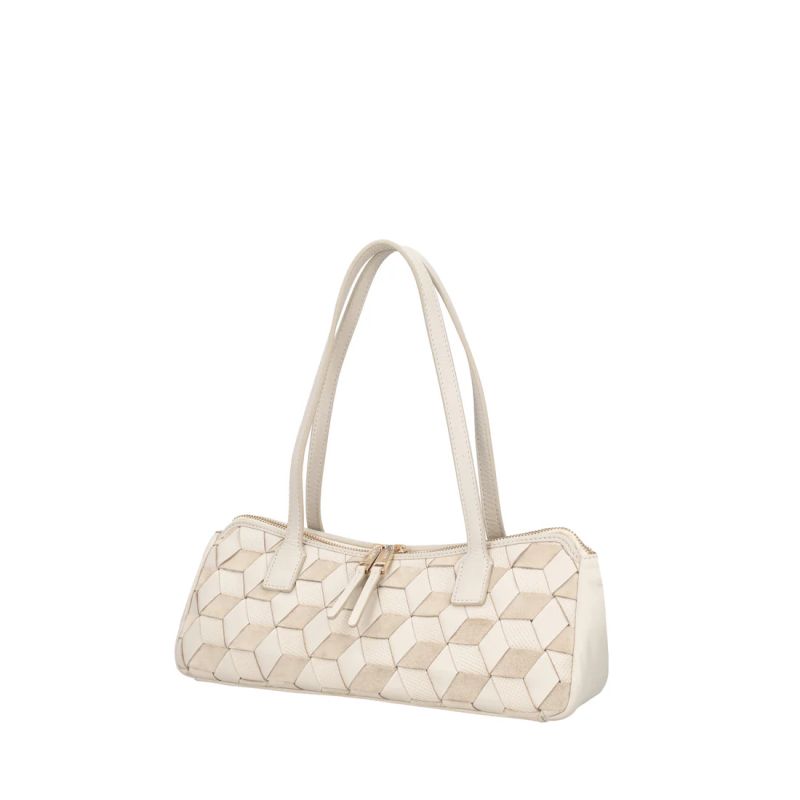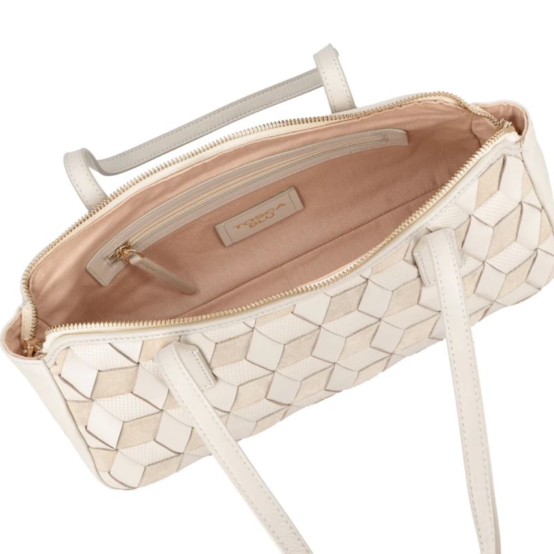 Привличащ погледа аксесоар, който ви съпътства през ежедневието. Тази чанта през рамо в цвят слонова кост е изработена от 100% кожа, с преплетена кожа и велур, който създава триизмерен мотив, съчетаващ гладка, велурена и микроперфорирана повърхност. Удълженият, компактен дизайн е с двойно затваряне с цип, което превръща тази чанта през рамо в незаменим аксесоар за съвременната жена.